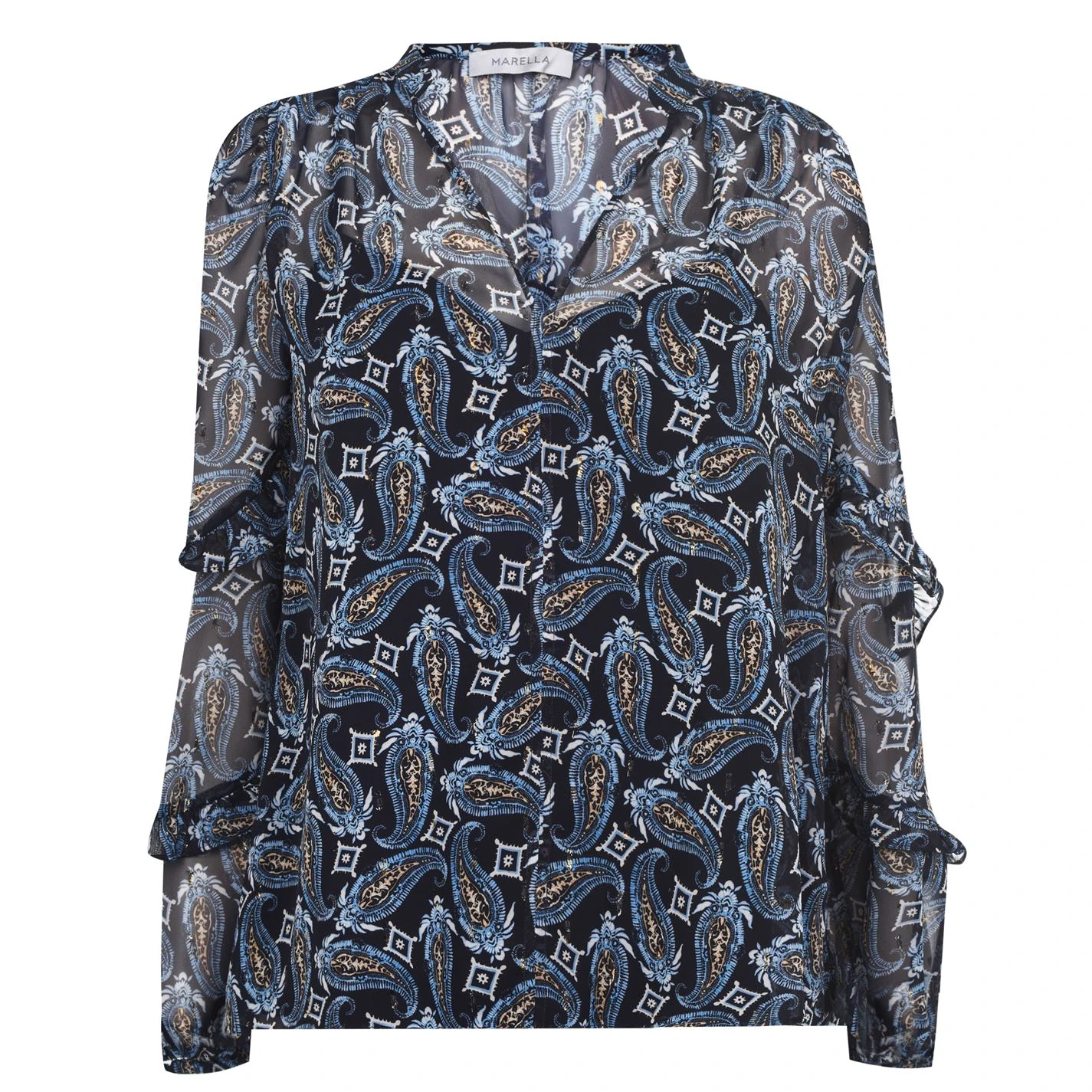 Elevate your collection with this Marella Nivose Blouse. Crafted with a stand collar and a V neck for a classic look, it features long sleeves with elasticated cuffs for a classic look. This blouse is an all over print design with ruffle detailing and is complete with Marella branding.